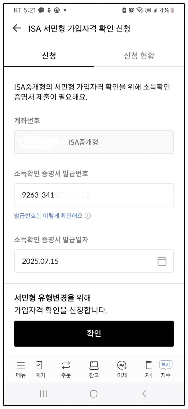 한국투자증권 앱에서 ISA서민형 신청 방법