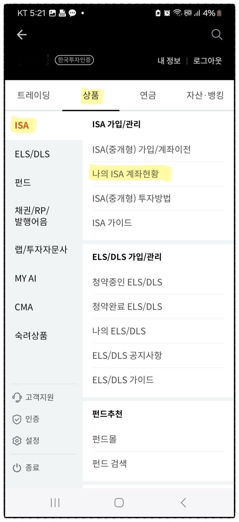 메뉴 > 상품> ISA > 나의 ISA 계좌현황