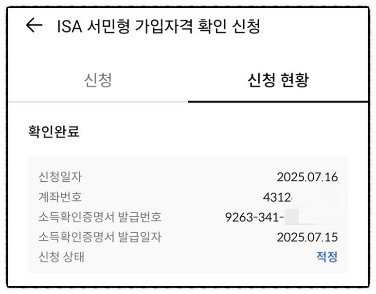 ISA 서민형 가입자격 확인을 위한, 소득확인 증명서 발급번호를 등록한다.