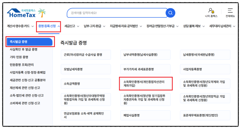 홈택스 로그인 > 증명/등록 신청 > 즉시발급 증명 > 소득확인증명서(개인종합자산관리 계좌가입)
